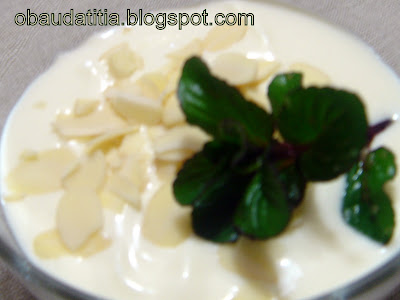 Levei ao frigorífico e antes de servir coloquei amêndoa fatiada por cima e 1 raminho de hortelã.