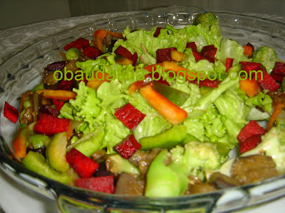Separadamente juntei a alface, o pimento,a beterraba e adicionei no meio da saladeira, polvilhei com o miolo de noz e orégãos, rectifiquei o tempero com um pouco de azeite.